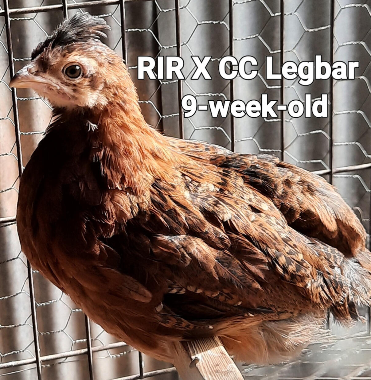 The CC Legbar/RIR is a hybrid from a White Leghorn pure breed and a Crested Cream Legbar. They are good layers producing over 225 large brown eggs year round.