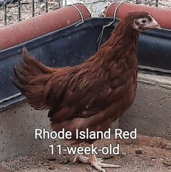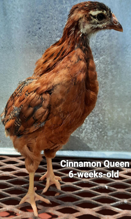 Cinnamon Queens are a Rhode Island Red rooster crossed with a Rhode Island White hen producing a red sex-link hybrid that matures early and lays 300 large brown eggs per year. They're a docile sweet hen that often seeks out your affection. They're a non-aggressive breed that does well in a mixed flock.