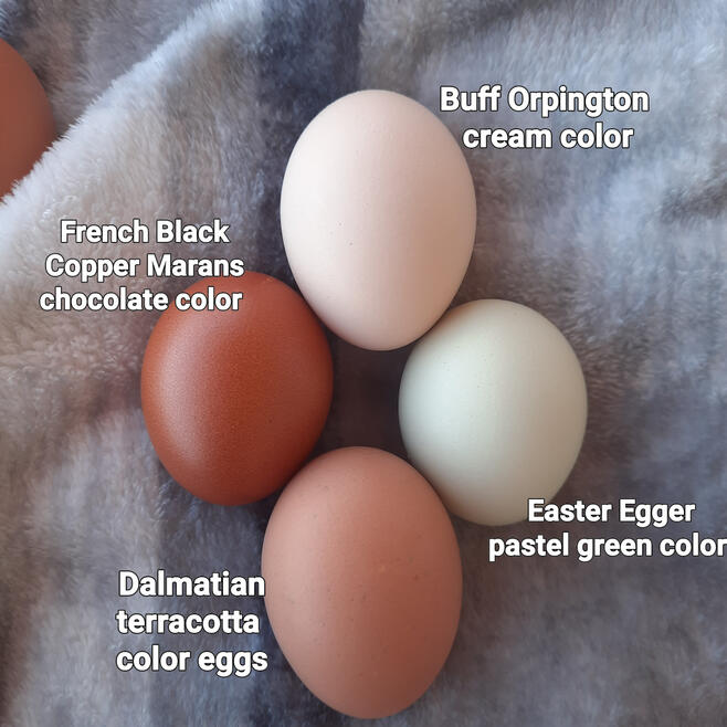 Dalmatians are a cross breed of French Black Copper Marans hen and a White Leghorn rooster. They're known for producing a terracotta to dark pink color egg. They're prolific egg layers laying 4 to 5 eggs weekly. Their body structure is not as slender as the Leghorn. They have a stockier build like the Marans. They don't have the flighty temperament of the Leghorn but, gentle like the Marans.