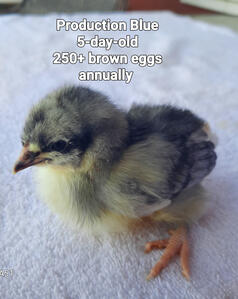 They're a beautiful dual purpose hybrid that will add a beautiful color to your flock. They start laying at eighteen weeks and lay an abundant 250+ large brown eggs a year. Production Blue's are a Blue Australorp crossed with a Rhode Island Red. They're a docile chicken and do well in a mixed flock.