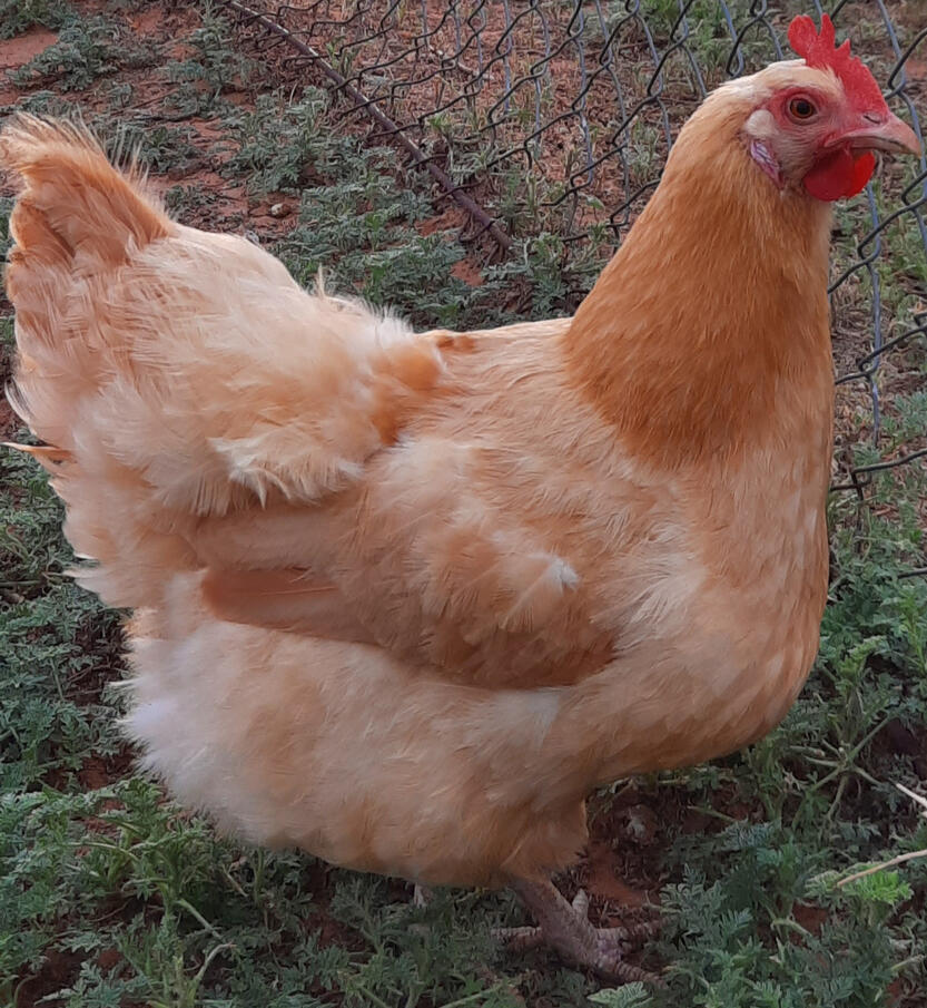 The CC Legbar/RIR is a hybrid from a White Leghorn pure breed and a Crested Cream Legbar. They are good layers producing over 225 large brown eggs year round.